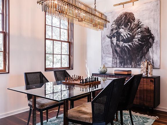 - Walnut floors and large windows with walnut trim