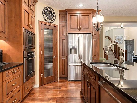 This stunning ALBI Estate home in the heart of Cranston is a true showpiece, blending timeless craftsmanship with modern updates and luxurious comfort throughout. Set on a quiet, family-friendly circle with no through traffic, it greets you with a stucco exterior, exposed aggregate walkway and driveway, and beautifully manicured landscaping. Inside, the attention to detail is unmistakable—from the rich Acacia walnut hardwood flooring and 9-foot ceilings on the main level to the Alder cabinetry, high-end BOSCH appliances, elegant light fixtures, and custom Hunter Douglas blinds. The bright, open layout offers both style and functionality, with a spacious bonus room upstairs and three large bedrooms including a beautiful primary suite featuring a walk-in closet and a luxurious five-piece ensuite. The professionally developed basement adds even more living space with a fourth bedroom (also with a walk-in closet), a large family room with plumbing for a wet bar, and full-size windows that flood the area with natural light. Recent upgrades include new carpet and laminate flooring (2023) and a new hot water tank (2023), while the heated double garage is immaculate with epoxy floors, hot and cold water, a drain, and extra storage. The outdoor living space is equally impressive, featuring a large deck with privacy screening, a luxurious hot tub, permanent exterior soffit lighting, and an underground sprinkler system that keeps the yard lush and vibrant. Additional features include central air conditioning, a gas line for the BBQ, water softener, and upgraded carpet underlay for added comfort. Located in one of Calgary’s most desirable communities, residents enjoy access to Cranston’s Century Hall—a 22,000 sq. ft. facility offering yoga, art classes, sports courts, splash park, tennis, and skating rinks in winter—all included in the affordable HOA fee. With its combination of elegance, thoughtful upgrades, and unbeatable location, this exceptional home offers everything a family could ask for and more.