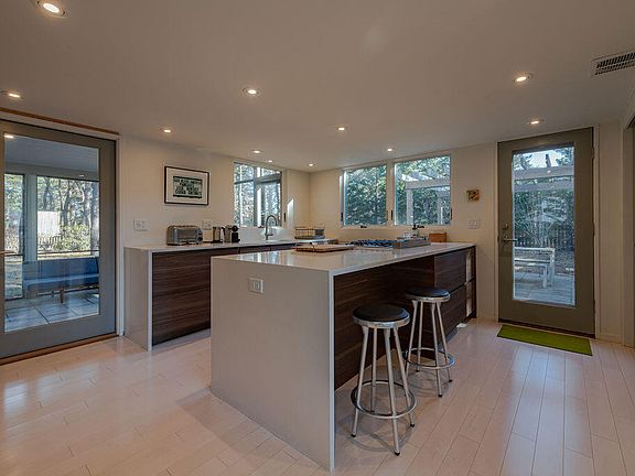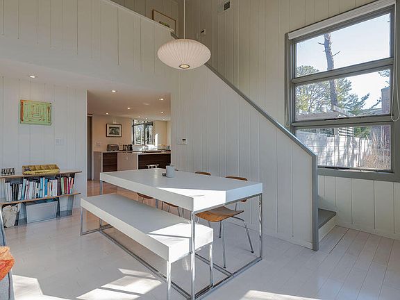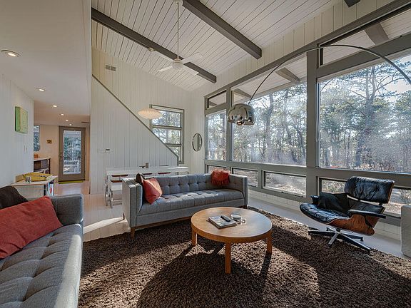 Indian Neck - Unparalleled location. Nearby bayside, sandy, swimming beaches plus hiking trails together with cycling, canoeingand kayaking. Stroll around Sewell's Gutter to uncrowded Hiawatha beach nearby. Architecturally significant Luther Crowell designed/built mid century modern home. Immaculately renovated and expanded. Meticulous interior with vaulted ceilings. Living room equipped with a contemporary design wood burning stove. Ceiling fan. Bedroom/office/den on first floor plus laundry. Fully renovated custom bathroom. Kitchen is open through to dining and living room and doors thru to expansive porch plus another leads outside to patio area. Kitchen offers plenty of storage space and high-end appliances. Breakfast bar. Upstairs balcony overlooking living room below two bedrooms and fully renovated custom bathroom. Efficient heat/AC provided by two Fujitsu Halcyon ducted mini split system. Cooktop and water heater fueled by propane. Solar power is a viable option. Outside: private enclosed yard, custom outdoor shower and two storage sheds. Addition (16x6) adds 192 sf = TOTAL 1113.sf. More expansion available. Exceptional property.