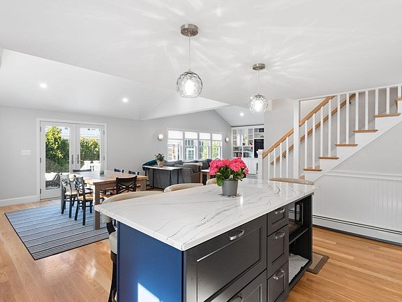 Originally built in 1953, this beautifully reimagined home has been transformed into a spectacular three level colonial with a modern open floor plan with 4-5 bedrooms, 2 full baths, and versatile living spaces throughout. The heart of the home is a chef's kitchen featuring custom tilework, stainless appliances, custom cabinetry and an oversized quartz island-perfect for gathering with family and friends. First floor features a bedroom, fireplaced living room, vaulted ceiling family room with custom millwork, a playroom, dining area with French doors that open to the private yard complete with a natural gas fire pit! Upstairs, you'll find 3 bedrooms and convenient second floor laundry. The fully finished 3rd floor adds even more space, currently used as a bedroom and office. Located in the highly desirable Sand Hills/ Oceanside neighborhood and NOT in a flood zone, you will love being steps from the beach and close to vibrant Scituate Harbor, marinas, golf, and Commuter rail. Lovely!