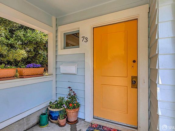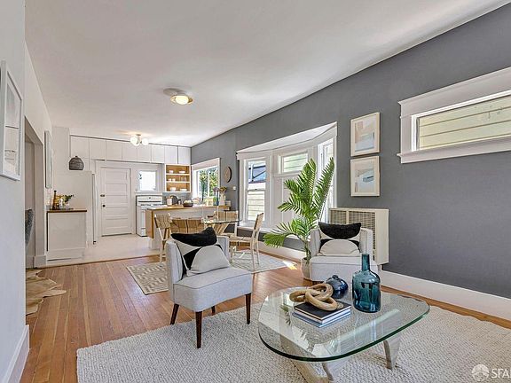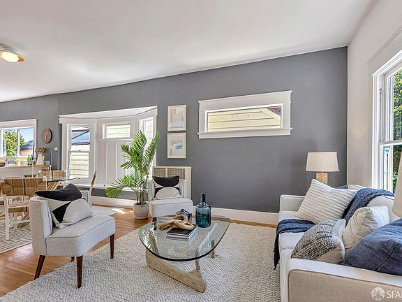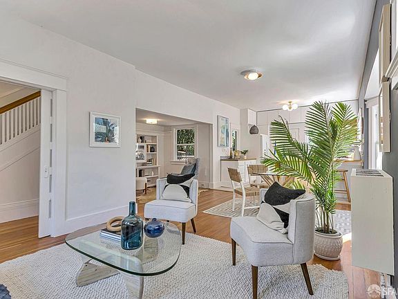 Private and enchanting, a special home set atop Bernal Hill with views of the San Francisco Bay. The quaint neighborhood location provides a country setting within the city. Picket fenced front yard and covered porch welcome you home to a fully detached, multi-level single family home. Main level with an open concept living room, dining area, kitchen plus office nook. Upstairs are two bedrooms with beautiful vistas and one sunlit bath with a skylight. Numerous windows flood the living spaces with sunshine, a built-in bookcase, bay window with bench seating, softwood floors and period details create historic charm. Kitchen features ample cabinets, newly refinished butcher block countertops, breakfast bar, newly installed tile backsplash, easy access to the rear yard. Wake up to views of the San Francisco Bay from primary bedroom, 2nd bedroom view of the western skyline. Great basement to use for hobbies, art studio, or ample storage. Enjoy recreation on Bernal Hill, Farmer's Market, numerous parks, playgrounds plus Cortland Ave. shops. The backyard with garden area provides a private retreat to enjoy this unique setting.
