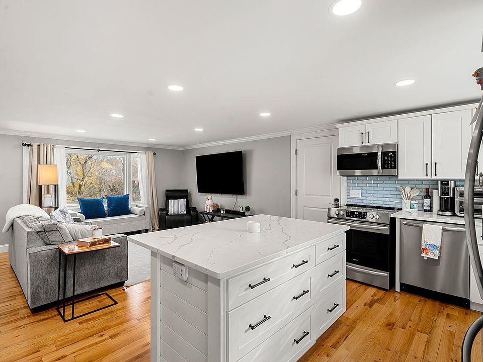 Dreaming of a home for the HOLIDAYS? There's time to be in! Completely remodeled ranch, single floor living. Come fall in love with this 3 bedroom, 1 bathroom home in a convenient Dover location, close to highway, train stations, schools and booming downtown. Enjoy Hardwood floors in the open concept kitchen, living and dining rooms, gorgeous island with Quartz counter tops and SS appliances. 3 ample sized bedrooms and remodeled bathroom. Fabulous three season porch. 1 car attached garage complete with EV charger. The full unfinished basement provides tons of storage. This home is energy efficient with leased Tesla Solar Panels. Small HOA fee includes landscaping and plowing so you can do less and enjoy your life.