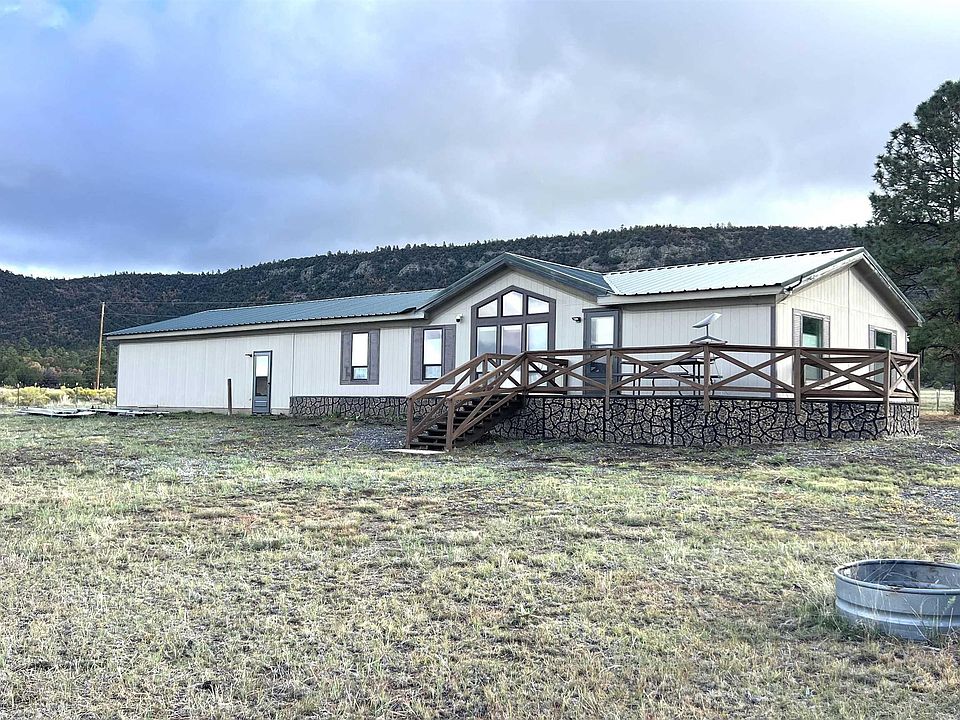 This beautifully renovated home is nestled in a valley near Armijo Springs, surrounded by National Forest. 10 fenced/cross-fenced acres. Horse barn with automatic water system. Gorgeous mountain views. This area is known for trophy elk and mule deer. The home looks and feels new. Large windows showcase the mountain views. Fully furnished rooms are waiting to welcome you home. Recent updates include: metal roof (2022), plumbing replaced with PEX A pipes (2023), premium vinyl flooring (2024), ceiling fans, new windows, and both exterior and interior paint (2025). An oversized, two-door garage provides substantial space for vehicles and workshop needs. Grounds have been well-maintained. Priced below appraisal value for instant equity!