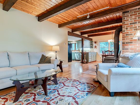 This home is sited on an elevated lot containing 2.5 acres in historic Winnocks Neck. A large brick patio/walkway leads to the south facing main entrance. Entering you will find a 3 story Atrium Foyer with tile floor, 2 stories of south facing windows, exposed beams with double glass sliding doors. The Livingroom/dining area is open to the kitchen, exposed beams, hardwood floor and woodstove with exposed chimney.Kitchen has hardwood floor with stainless refrigerator, range and dishwasher. A full bath/ laundryroom completes the first floor.