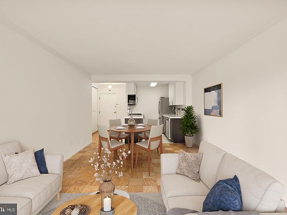 Comfort and Convenience await at 730 24th St NW #203! This well-proportioned 1 Bedroom/1 Bath unit with garage parking at Potomac Plaza Terraces is sure to amaze. Opening the door, you are greeted by the refinished gorgeous original wood floors and spacious entry way leading you into an updated and open kitchen concept living/dining area flooded with natural light from the oversized sliding doors, which take you out to a large terrace/balcony offering breath taking green scape views. Coming back inside you will be pleasantly surprised to find an updated and expanded chef’s kitchen, showcasing stainless steel appliances to include a 5-burner gas stove, bottom freezer French door fridge, a full-sized microwave, and a full-sized dishwasher. White Shaker style upper/espresso lower cabinets provide ample kitchen storage for all your needs. White quartz counters, a large stainless-steel sink with disposal, and custom tile backsplash and flooring round out the space. A huge hall closet, perfect for installing a stackable washer/dryer, is just one of three expansive storage spaces inside the apartment. The fully renovated bathroom features more custom tile work, bespoke lighting, ample storage with the vanity and mirror cabinet, a spa like tub/shower, and dual flush toilet. Making your way into the bedroom you will find a spacious walk in closet and adjacent storage closet with built in shelves. Custom bespoke overhead light fixtures compliment the one in the bathroom, for an attention to design detail not often found. The king-sized bedroom offers plenty of space to accommodate most any furniture decor. The custom roman style black out window treatment ensures that no matter the time of day, you have the option for optimum rest. Amenities include a 24-hour front desk, laundry facilities, a communal rooftop terrace with stunning city views, and a pet-friendly building. This prime location is conveniently close to grocery stores (including Whole Foods and Trader Joe's), coffee shops, the Foggy Bottom Metro, the Kennedy Center, George Washington University and Hospital, the State Department, Georgetown, and more. Sellers have paid the special assessment in full. Building allows installation of washer/dryer. Welcome Home!