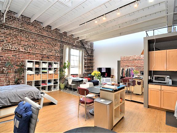 This 2nd-floor loft combines old-school character with modern updates. Soaring ceilings, oversized windows, and a dramatic skylight flood the space with natural light, while hardwood floors and a mezzanine sleeping area make it both stylish and functional. The full kitchen features a gas range and refrigerator, and the large bathroom comes with a full tub. Freshly painted and move-in ready!