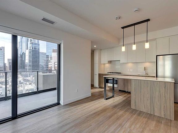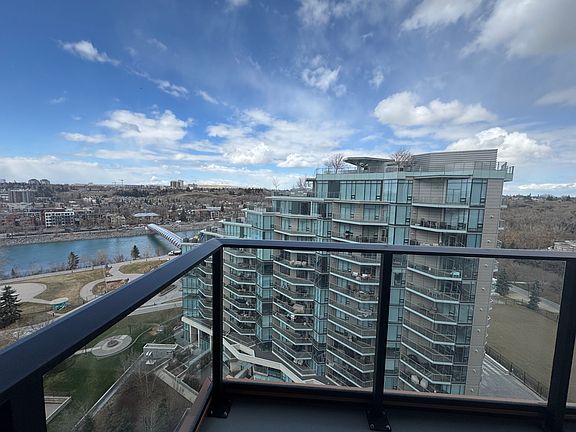 Experience elevated urban living with this exquisite 2-bedroom + den, 2-bathroom, end unit condo, ideally located in the vibrant and sought-after Eau Claire neighborhood. Nestled on the 14th floor this unit offers unparalleled views of the Bow River and the iconic Peace Bridge, steps from Prince's Island Park, scenic river pathways, and Calgary's vibrant downtown core.- This home features sleek vinyl plank flooring throughout, a spacious open floor plan with 9' ceilings, and floor-to-ceiling windows throughout the main living areas.- The modern kitchen is equipped with premium Fulgor stainless steel appliances, including a gas cooktop, porcelain marble countertops and backsplash, under-counter lighting, and island.- The primary bedroom serves as a peaceful retreat, with its own private ensuite featuring contemporary fixtures, while the second bedroom is perfect for guests or an additional den area.- The main bathroom continues with modern finishes and a contemporary design.- Working from home has never been easier with a secluded office space, or make this an additional storage area.- Extend your living space with a large 18ft X 18ft wrap-around balcony - enjoy early morning sunrises, late sunsets, and peaceful views of the Bow River.- In-suite laundry- Additional storage locker- Window coverings throughoutThings to Know:- Available Now! Move in anytime in May on a 1 year lease starting June 1st 2025.- Rent includes heat, water and 1 underground parking spot.- Air Conditioning throughout the building.- Tenant pays for their own electricity, internet/cable/phone as required.- This building boasts impressive amenities, including a sophisticated lobby, a meeting room, a fully equipped fitness and yoga studio, and an owners' lounge perfect for social gatherings. With daytime concierge services and secure bike storage, convenience is seamlessly integrated into your urban lifestyle. This condo offers effortless access to downtown's vibrant shops, dining, entertainment venues, and the +15 Network indoor walkways. Enjoy the perfect balance of urban convenience and natural beauty in this exceptional property, where city living meets tranquility. .