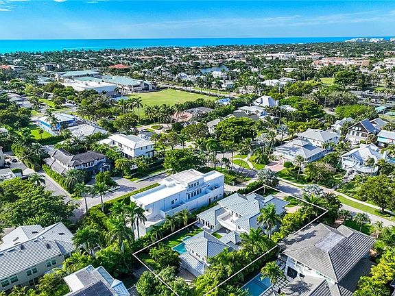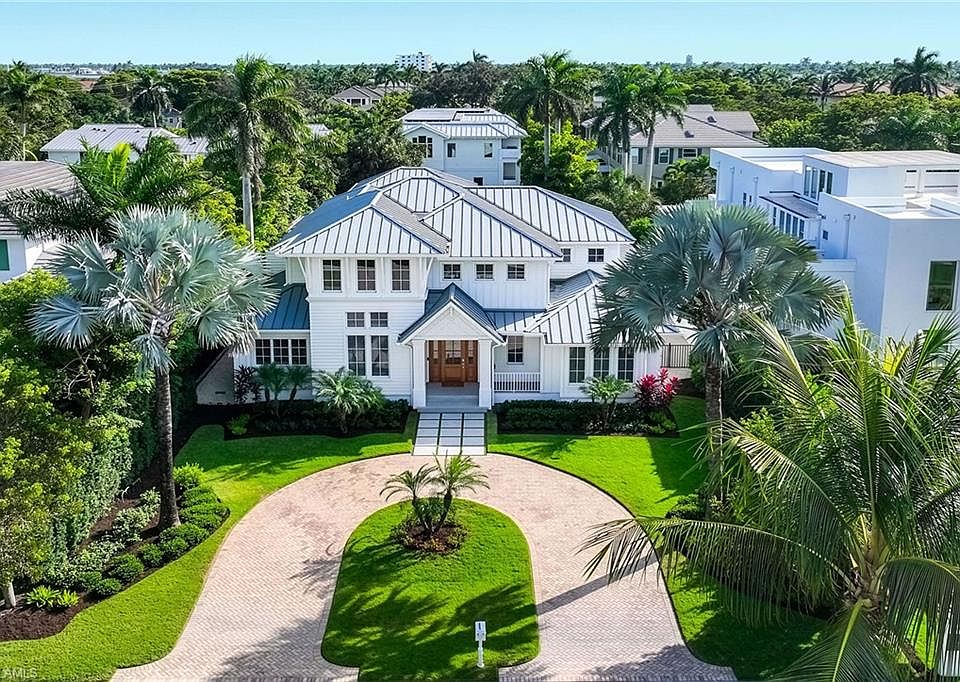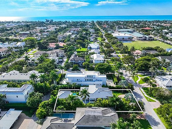 Embodying timeless coastal elegance, Seaglass Cottage emerges as an architectural masterpiece in the heart of Old Naples, a short distance from paradise, just seven blocks to the pristine Gulf Shores, four blocks to the vibrant shopping and dining on 5th Avenue and 3rd Street, epitomizing the pinnacle of Old Naples lifestyle. Celebrated as Home & Design Magazine's Signature Home of the Year and masterfully designed by MHK Architecture, this residence, completed in 2017 features a convenient first-floor main suite plus four additional en suites, totaling 6 1/2 baths. Desirable southern exposure for ultimate refined living. The chef-inspired kitchen boasts premium finishes such as Cristallo quartzite countertops, Ruffino cabinetry and top-tier Sub-Zero/Wolf appliances. As one of the select homes in Old Naples, upgraded from a traditional propane tank to continuous natural gas service. The outdoor oasis rivals a luxury resort, complete with a saltwater pool featuring a sun shelf, spa and waterfall, alongside an outdoor kitchen and fireplace.