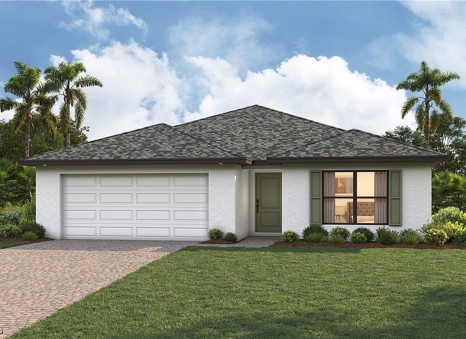 NEW CONSTRUCTION WITH WARRANTY! **Estimated delivery January 2026** The Palm offers 1,550 square feet of thoughtfully designed living space. The spacious Great Room with its vaulted ceiling flows effortlessly to the private covered lanai—ideal for indoor-outdoor living and entertaining. At the heart of this open layout, the kitchen features a freestanding island, walk-in pantry, and designer cabinetry, opening to a bright dining area with a tray ceiling and abundant natural light. The primary suite includes a generous walk-in closet and a private bath with dual vanities, a tiled shower, and convenient linen storage. Additional highlights include upgraded plank tile throughout the main living areas, designer cabinetry & quartz counters in the kitchen and baths, hurricane-impact windows and doors, stainless steel kitchen appliances, and an attached two-car garage. Pictures, renderings, & virtual tour are of similar home & are used for display purposes only.