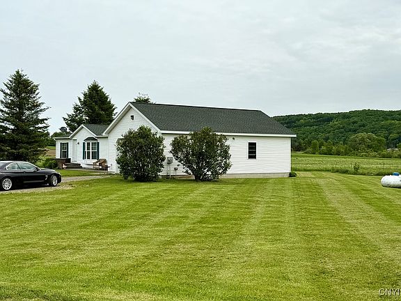 One level living on approximately 3 acres, with beautiful vistas in all directions, near Tully I 81 entrance. 2 full baths, 3 bedrooms, living room with beautiful fireplace. Kitchen is well laid out, easy to work in, with plenty of storage space. Main floor laundry. Oversized 900 sq ft 2-car wide garage is so deep it could easily accommodate 4 autos (tandem) .. a great place for storage or entertaining. Back 3rd of the lot is not currently mowed, and is a sanctuary of bird life. Door location for the 3rd bedroom was moved from the hallway to the living room (now a set of french doors lead into this room), which could still be a 3rd bedroom (with closet), it is currently used as office and sewing room. Roof is only 4 years old. Motorized awning provides pleasant shade over much of the deck in the summer. This ranch home is a manufactured home.