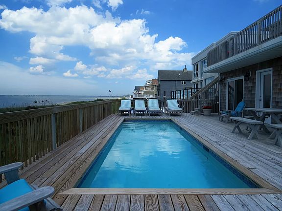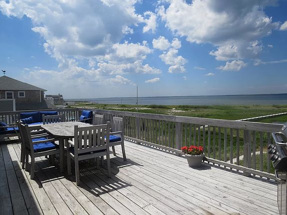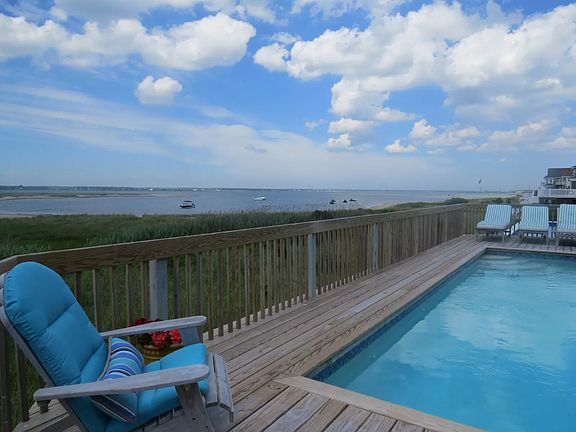 Lovely two story open bayfront Beach house with living area on the second floor and upper level decking. This home has four bedrooms plus a tv room that could possibly be a fifth bedroom, granite kitchen and large deck overlooking Moriches Bay. Heated swimming pool and outdoor hot/cold shower.