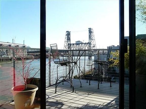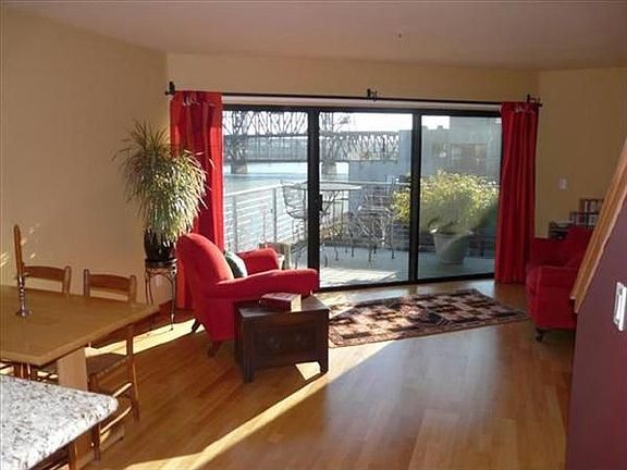 This 2 level, 1 bedroom condo has fantastic views and no units above! The main floor includes a kitchen - with granite counters, tile floor, built-in Microwave and all the rest of the appliances; the living and dining areas - have wood floors, an eating bar, and a deck overlooking the Willammette River and the Steel Bridge. The upper floor is a private master suite with wood floors, 2 great view windows, a full bathroom, a front load washer and dryer, and 3 closets. 1 assigned parking place...