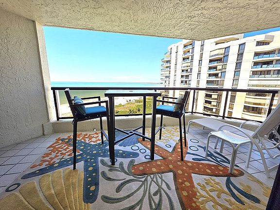 Stunning view of Marco Island's beautiful crescent shaped beach! This turn key beachfront condo offers a place to relax and enjoy all Marco has to offer. The master suite overlooks The Gulf and boasts a spacious en suite bathroom with separate vanities, a walk in shower, as well as an additional master tub/shower combo. A large walk-in closet gives space for a dresser as well as stack and hanging shelving. The lovely interior opens to the ocean front balcony appointed with table, 4 chairs, and lounger. Enjoy gorgeous sunsets, dolphins playing in the water, and the sound of the ocean waves. All furnishings including a recent king size sleeper sofa operated by remote are included. Give guests comfort with a view!