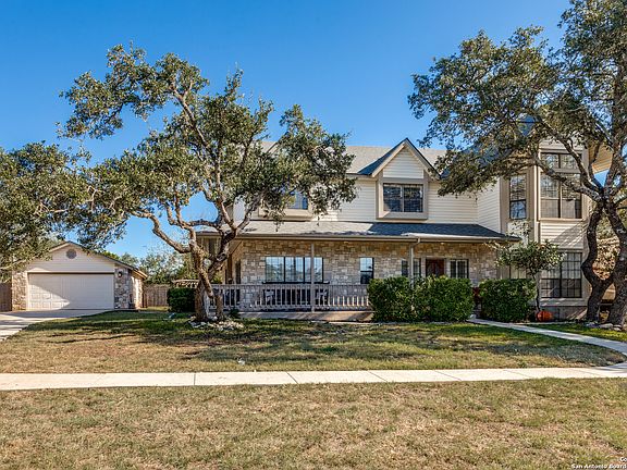 Nestled in the sought-after Timberwood Park neighborhood, this stunning home offers a perfect blend of Hill Country charm & peaceful suburban living-all w/ no city taxes! Resting on nearly half an acre (.47 acres), this spacious 4-bedroom, 2.5-bath home spans 3,053 sq.ft. & features a warm, inviting design both inside & out, accented w/a welcoming wraparound porch. Step inside to an oversized open living room anchored by a beautiful rockfireplace & enhanced by architectural details. Plantation shutters & custom woodwork throughout the home adds to its warmth and appeal.The large island kitchen is a chef's delight, complete w/expansive countertops, custom cabinetry, a breakfast nook, & walk-in pantry. A separate dining room just off the kitchen provides the perfect setting for family gatherings.The spacious primary suite, located on the main floor, includes a private bath w/ separate walk-in shower, garden tub, & a generous closet. Upstairs, you'll find 3 additional bedrooms, including one of the oversized bedrooms w/ an attached bonus room-ideal for a playroom, office, gym. Custom built-in bookcases located in a wide hallway w/open railing overlooks the living area and adds to the home's distinctive character.The backyard retreat features an in-ground pool w/ waterfall, a freestanding hot tub, storage shed and plenty of space for entertaining or relaxing under the Texas sky. Residents of Timberwood Park enjoy a host of neighborhood amenities,including swimming pool, golf course, stocked catch-and-release lake, pickleball courts,and community events such as open-air concerts in the park...just to name a few. Experience the best of Hill Country serenity w/city conveniences near by.