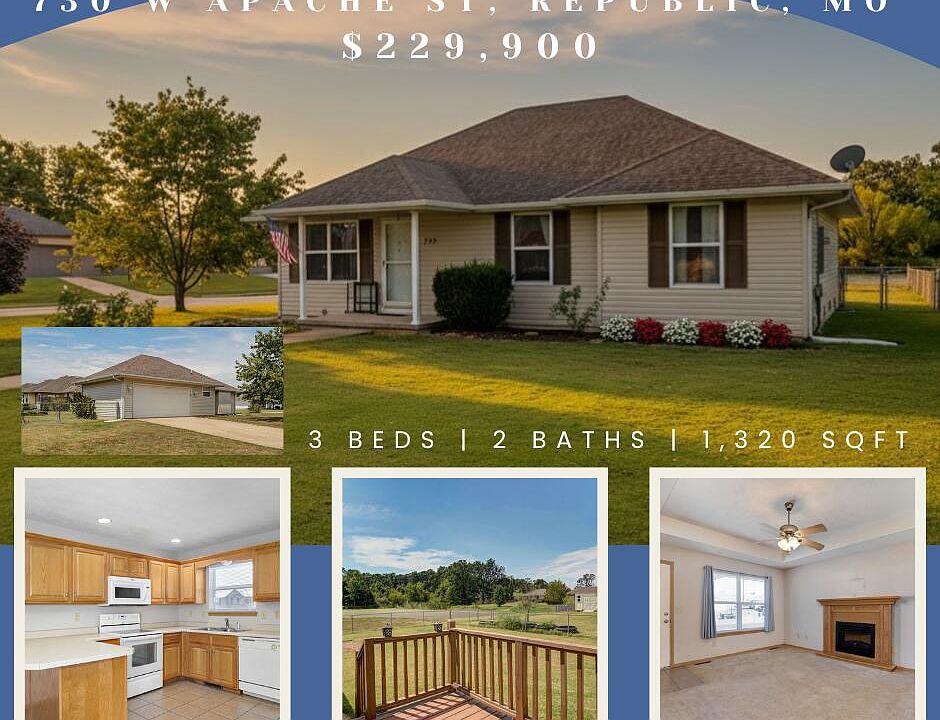 Welcome to this move-in ready 3-bedroom, 2-bath home located on a landscaped corner lot in Republic. Offering 1,320 square feet all on one level, this property features a comfortable living room with a fireplace, a kitchen/dining combo with a breakfast bar, and a functional layout throughout. The full chain link fenced yard provides usable outdoor space, while the rear-entry two-car garage adds privacy and convenience. Built in 2007 and newly refreshed, this home is vacant, clean, and ready for its next owner. Situated near local schools and amenities, it offers an excellent opportunity for anyone seeking a well-kept, easy-care home in Republic.
