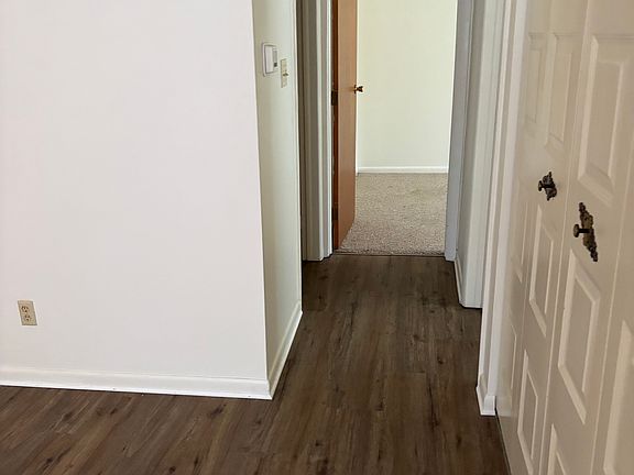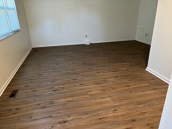 Freshly painted apartment with new luxury vinyl flooring in kitchen, family room, hallway, and bath.