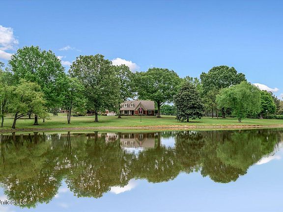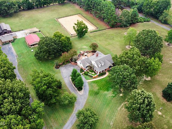Ranch located in the heart of Olive Branch. This estate offers 13.35 +/- acres, remote controlled electric security gate with keypad, fenced and crossed fenced, arena, approx. 3-acre lake, RV/horse trailer parking with designated 30-amp electrical service and waste station; stone ancillary building with heat, air, separate security system, two barns including one metal barn and one wood barn, tractor/equipment garage/workshop with additional lean-to, winding blacktop drive with alarm. Main home offers 6 bedrooms, 4 full baths and one half bath. Gourmet kitchen with granite countertops, tile flooring and backsplash, under cabinet lighting, décor glass cabinet door with accent lighting, island, stainless steel appliances, gas cook top, built-in oven and microwave, vent hood, Kitchen Aid built-in refrigerator, trash compactor, pantry with sliding drawers, free standing ice maker, open to 23.3x15.2 family room featuring built-ins with adjustable shelving and gun cabinet and fireplace with gas logs. Formal dining room with hardwood flooring, 22.5x18 great room with fireplace and gas logs, 15.10x15.5 primary bedroom with accent crown lighting, unbelievable primary closet measures 15.3x12 with island and custom shelving, salon bath with walk-in shower, separate soaker tub, two vanities - one with knee space, plus two more walk in closets. Also on the main level are 14.6x10.11 bedroom #2, 13.11x12.9 bedroom #3, and 2-1/2 baths. Upstairs leads to bedroom #4 measuring 15.6x10, with a private ensuite full bath and 5th 17.9x13.4 bedroom ideal for exercise or crafts. Access via a second staircase to bedroom #6, 17.8x16.1, with its own ensuite full bath and walk-in closet. Other amenities include laundry room with cabinets, bonus area to hold 2 refrigerators and/or freezer, pocket doors, two sets of permanent stairs with oak treads, 3 bedrooms down, 2-1/2 baths down. Spacious coat closet, multiple light switch dimmers, dual security systems for main home and stone building, butler's pantry with coffee bar and wine cooler. New architectural shingle roof installed fall 2024, brick and vinyl siding for low exterior maintenance. This home, built in 1988, was completely remodeled in 2003 and meticulously maintained... ask for details! Metal Horse Barn is 36x48 with four 12x12 stalls, tack/feed room with cabinetry, fly spray system, wash room with fiberglass walls, cold and hot water supply, insulated, stall mats, concrete aisle, gutters, sliding front and rear doors, large covered front porch, built-in fire pit, plus 90'x100' arena with sand. Wood Barn is 36x50 with tack/feed room, water and electricity. This barn makes a great loafing shed area and hay storage. Stone Ancillary Building: great for hobbies and has a half bath, closet, window AC and propane wall heat that services front of building. Includes attached garage with work benches, overhead door and lean-to on rear. All of this situated on 13.35+/- beautiful acres with approximately 3-acre lake loaded with fish, fenced and cross fenced (majority vinyl fencing), scattered mature trees, designated area irrigation system, accent exterior lighting with timers, attached double garage with epoxy coating floors and pine tongue and grove ceiling, gutters, huge patio with built-in serving bar, wrap around porch. Call now and bring on the horses! Owner agent. https://youtu.be/blmG57c9mcI