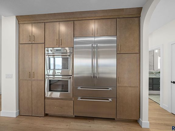 The heart of the home is the chef-inspired kitchen, boasting a striking quartz waterfall island, premium Thermador appliances (including a built-in refrigerator), and custom white oak cabinetry. Under-cabinet lighting and an oversized hidden pantry complete the space.