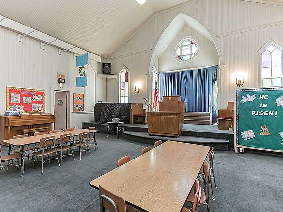 Church building is set up inside for use as a church, school and daycare. Folding chairs are brought down from upstairs for church services. Auditorium seating capacity 250 people. Church office includes Two existing phones lines, a second phone line for fire department, security system, fax line and DSL. There is also a fenced in playground. 3 bedroom 2 bath mobile home previously used as the parsonage. Propane in Parsonage for heating, cooking, fireplace. Large 2 story storage shed with loft has electric lighting. Church Office includes commercial copier/fax and hardwired computer system. Brinks Security system in place providing fire/theft security for all three buildings, and church building is connected directly to the fire department. New owner would have to reconnect to Brinks. Commercial Septic System with dry well for Entire church property. Private well. Public utility tap-ins available on-site. Property has been vacant and heat has been kept on and water turned off. Purchaser to confirm feasibility for intended use. Current property owners tax exempt due to Religious Facility, not exempt from County Rain tax of $121.00.