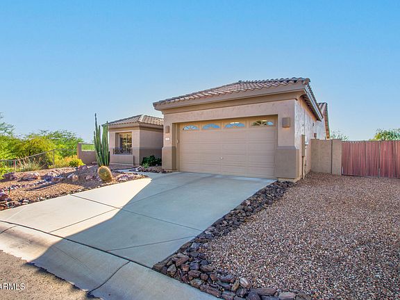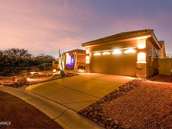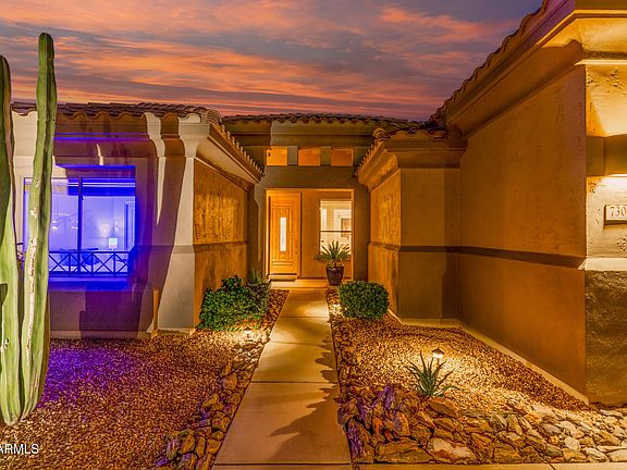 Tucked away on a peaceful cul-de-sac in the prestigious Las Sendas community, this exquisite 3 bed/2 Bath property is ready to impress! You're greeted by a 3-car tandem garage (extended 4 feet from the basic model) equipped with a 220V outlet (50 amp), RV gate, and undeniable charm. Inside, discover a cozy den perfect for a home office or creative studio. Enjoy elegant details throughout, including pre-wired surround sound, vaulted ceilings, wall niches, and a warm gas fireplace that sets the mood for any occasion. The kitchen boasts stainless steel appliances, wall ovens, rich wood cabinetry with a wine rack, gleaming granite counters, a center island with a breakfast bar, and a pantry for all your essentials. After a long day, unwind in the luminous primary retreat featuring a spa-like ensuite with dual sinks, a soaking tub, and a generous walk-in closet. Outdoors, paradise awaits! Entertain in style under the covered patio or attached Ramada, grill up favorites at the built-in BBQ, and cool off in the sparkling pool before soaking in the spa under the stars. As the day winds down, sip your favorite drink and watch the sun melt behind the mountains, an experience that never gets old. This Las Sendas beauty truly has it all, offering comfort, style, and views that will steal your heart. Come see the magic for yourself!