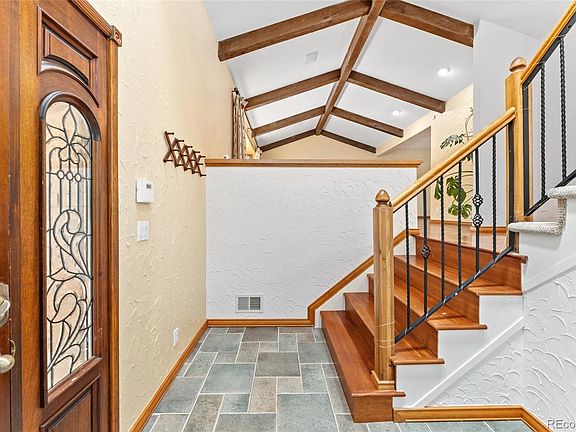 Nestled on a quiet street in Boulder Country Club, this wonderfully updated custom tri-level home sits on an oversized lot, offering exceptional privacy and a beautifully landscaped setting. The impressive living room welcomes you with a dramatic beamed vaulted ceiling and rich cherry wood floors that create a spacious and inviting atmosphere, flowing seamlessly into the elegant dining room and gorgeous kitchen. The kitchen features granite countertops, stainless steel appliances, and refined finishes including skylights, arched doorways, and skip trowel walls that add timeless character throughout the home. The lower level family room is a true gathering spot with plush carpeting, a stylish wet bar, and a cozy fireplace, perfect for entertaining or relaxing. Upstairs, you will find spacious bedrooms including a luxurious primary suite accessed through double doors. This serene retreat boasts ample closet space and a spa-inspired five-piece bathroom with a heated floor, designed for comfort and elegance. An oversized bonus room provides versatile space for a home office, playroom, or creative studio. The finished basement adds even more living space featuring modern touches in the recreation room, a conforming bedroom, and an ensuite bathroom ideal for guests or multi-generational living. Additional features such as a solar roof and power walls bring energy efficiency and sustainability to everyday living. Blending classic architectural details with thoughtful modern updates, this residence embodies a harmonious balance of style and functionality. From its peaceful, private setting to its expansive living spaces designed for both everyday comfort and grand entertaining, this home invites you to experience a truly elevated lifestyle in Boulder Country Club.