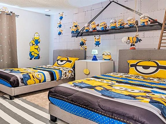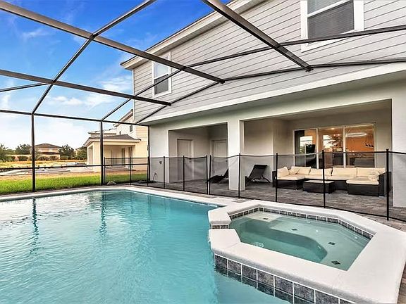 Priced to sell. Welcome to 7303 Oak Moss Loop in the guard gated Solterra Resort, a 7 bedroom 5.5 bath fully furnished vacation home that checks every box for personal enjoyment and high performing rental income. Inside you will find tile in the main living areas, soft carpet in bedrooms and loft, a bright open concept kitchen with granite counters, large island, stainless steel appliances and plenty of storage to serve large groups. There are 2 primary suites, one on the first floor for easy access and another upstairs, plus 5 additional guest rooms that are beautifully themed and professionally decorated to delight vacationers. Sliding glass doors open to a screened pool and spa with covered lanai that create the perfect Florida outdoor living space. The garage is converted to a fun game room which adds to guest appeal and helps bookings. Solterra Resort offers a true resort lifestyle with lazy river, clubhouse, fitness center, poolside cafe and convenience store. HOA includes internet, lawn care and daily trash pick up which helps control expenses. Located minutes to Walt Disney World, Universal, shopping, dining and medical facilities this home is an easy to own, ready to rent opportunity. Use it as your personal getaway and rent it when you are not here. Turnkey, beautifully maintained and priced right.