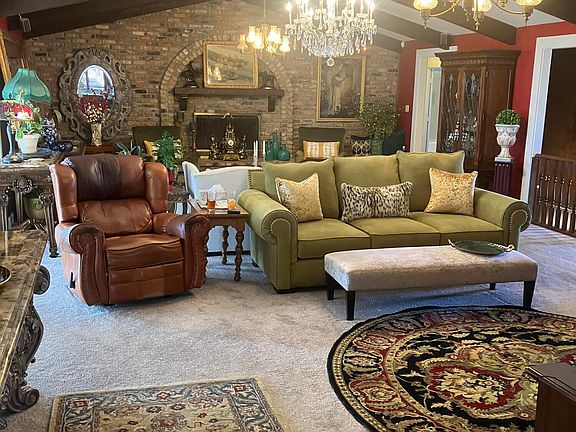 - Description: Carpet, Curtains, Cathedral Ceiling, Large Brick Fireplace
