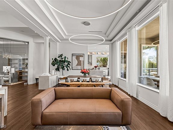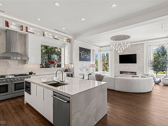 A move-in ready home built on precision, intention, and a commitment to getting every detail right. Set within the gated enclave of Canyon Mist Estates in NW Las Vegas with polished curb appeal, mountain views, greenery, and peaceful walking paths, this home delivers calm and pride of ownership. Step inside to soaring ceilings, elegant columns, and natural light that fills every space. Glass double doors off the entry open to a home office with a presence of its own. The sleek European-inspired kitchen features high-gloss cabinetry, Calacatta-style quartz, and a seamless waterfall island that anchors the open layout. Soft LED-lit ceilings and sculptural lighting give each room its modern edge. The primary suite sits in its own private wing with direct access to the yard, a marble bath, and a custom walk-in closet. Outside, the resort-style pool, spa, & covered patios shape a backyard you don’t come across often in Vegas. This home doesn't just meet the highest standards, it sets them.