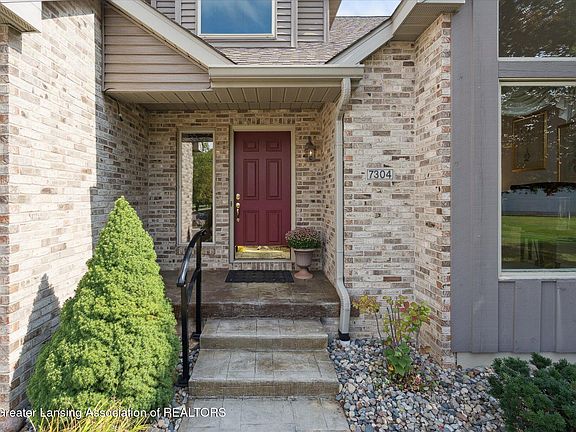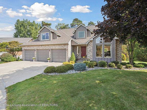 Welcome to 7304 Players Club, a custom-designed home in the sought-after Players Club Estates of Delta Charter Township, located within Grand Ledge Schools. Perfectly situated on over an acre with unmatched privacy, this property offers serene surroundings on a quiet cul-de-sac with direct access to nearby nature preserves and trails. Buried utilities help keep the power on during storms, while the protected preserve provides a permanent buffer, ensuring no future development behind. Inside, a striking two-story foyer sets the tone as timeless craftsmanship blends with modern updates. Red oak flooring, oak accents, and a statement chandelier showcase the home's character, while newer countertops (2016), updated appliances, and a remote-controlled gas fireplace add comfort and style. The flexible floor plan features 5 bedrooms, a first-floor office with tranquil views, both formal and casual living spaces, and a spacious bonus room above the garage.The finished walkout lower level lives like its own suite, complete with a kitchenette, living area, full bath, and bedroom (previously used as a second home-office) with a walk-in closet, ideal for guests, multi-generational living, or in-laws. It connects seamlessly to the main level and includes a sloped, step-free walkway leading directly to the driveway. The primary suite offers a private balcony overlooking the property, a spa-inspired bath with tile shower, separate toilet room with its own vanity, jetted tub, dual vanities, dressing area, and a generous walk-in closet. Additional highlights include an oversized 3-car garage with extra-tall bays, drainage, and fire sprinklers; a dedicated lower-level workshop with built-in shelving; multiple storage areas; a mudroom/drop zone; and an upstairs laundry chute. Outdoor living shines with a large wraparound deck overlooking the private backyard, stamped concrete entry, under-deck storage, and irrigated front and back lawn. Recent improvements include newer siding & roof, furnace and A/C (2022), and a 75-gallon water heater. Offering space, functionality, and a one-of-a-kind setting, this home combines comfort and convenience, just minutes from highways, shopping, and schools.