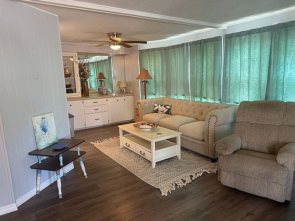 Step inside to find fresh updates throughout, including new flooring in every room and energy-efficient LED lighting. The spacious kitchen features 3 year old appliances, a generous eat-in area with seating for six, plus a separate dining area with a built-in server and extra storage. The inviting living room includes a large-screen TV and new e-glass windows, with sliding doors that lead to a cozy lanai—perfect for enjoying Florida’s warm breezes.