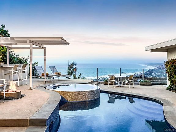 This meticulously renovated 5-bedroom Mid-Century Modern gem offers a rare opportunity to embrace unparalleled coastal living. With panoramic white-water ocean views that stretch gracefully up the north coast and stunning sunrise vistas to the east, this home captures the essence of La Jolla's natural beauty. Remodeled down to the studs in 2011, this home was designed to take full advantage of the spectacular views, flooding the spaces with natural light and creating an extraordinary connection to the outdoors. Upon entering, you are immediately struck by the home’s clean lines, open spaces, and seamless flow between the interior and exterior. Expansive walls of glass invite the surrounding landscape indoors, offering a light-filled atmosphere that’s perfect for both relaxation and entertaining. The spacious great room opens onto the outdoor patio, where the views of the sparkling ocean are simply breathtaking. Ideal for hosting guests, the home features a fully equipped outdoor kitchen, perfect for al fresco dining, as well as a fire pit and lounge area to enjoy the stunning coastal setting. The chef’s kitchen, remodeled in 2022, is a culinary dream, complete with high-end appliances, sleek finishes, and a large central island that serves as both a prep space and a gathering spot. A spacious dining area flows seamlessly from the kitchen, offering an idyllic setting for intimate dinners or grand gatherings. The primary suite is an extraordinary retreat featuring spectacular views, a large walk-in closet, and a spa-like bathroom featuring premium finishes. This is a rare opportunity to enjoy spectacular views and exceptional living spaces from one of La Jolla's most coveted enclaves!