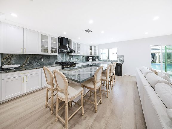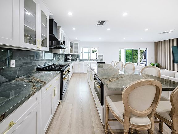 Inside discover an inviting living room that flows seamlessly into the formal sitting area and dining space, perfect for entertaining. The remodeled kitchen is a showstopper with sleek white cabinets accented by gold hardware, high ceilings, recessed lighting, and all appliances included.