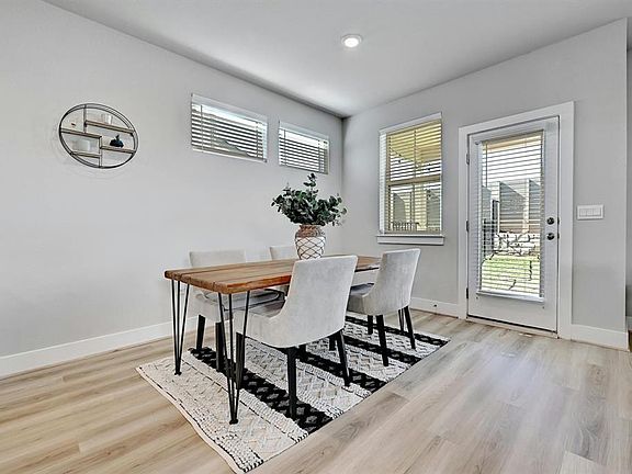 Discover chic and modern living in the vibrant community of Easton Park! This contemporary home welcomes you with a bright and open main living area that effortlessly combines the living, dining, and kitchen spaces, making it an ideal setting for both relaxing and entertaining. The kitchen shines with quartz countertops, shaker white cabinetry, and a spacious island that includes additional storage and a breakfast bar for casual dining. A conveniently located charming half bath on the ground floor adds ease for both friends and guests. The second floor unveils a versatile flex room that can serve as a second living area, game room, or in-home office, adapting to your lifestyle needs. Retreat to the large upstairs primary bedroom, where a stepped ceiling enhances the sense of space and luxury, accompanied by an ensuite bathroom with dual sinks and a walk-in shower. Two additional secondary bedrooms ensure ample space, while a spacious laundry room adds practicality to elegance. Set in the heart of Easton Park, the community of Union Park is surrounded by amenities designed to enrich your life. Enjoy access to paved trails for leisurely walks or energetic bike rides, Union Bark dog park for your furry friends, and a community that embraces outdoor living. Experience the perfect blend of style, comfort, and convenience in a community that offers the best of urban living amidst a natural setting.