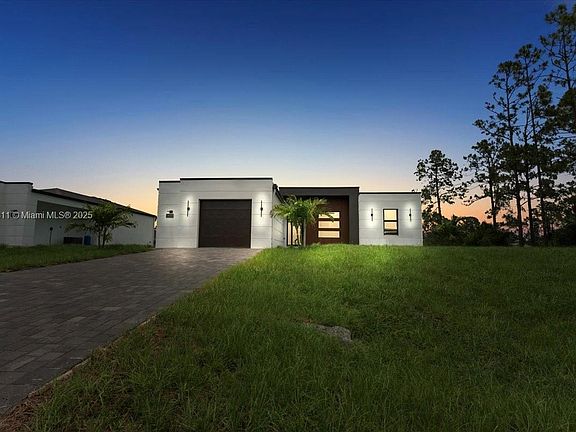 SELLER OFFERING BUYER CONCESSIONS. Don’t miss this move-in-ready home with builder’s warranty included. Modern new construction in Lehigh Acres! This 3-bedroom, 2-bath home offers 1,292 sq ft of living space with an open floor plan, 10-ft ceilings, and stylish finishes throughout. Built with impact windows and doors, porcelain tile flooring, and Calacatta quartz countertops with a waterfall island. Bathrooms feature LED mirrors, floating vanities, and frameless glass showers. Exterior includes paved driveway, epoxy garage floor, and irrigation system.
