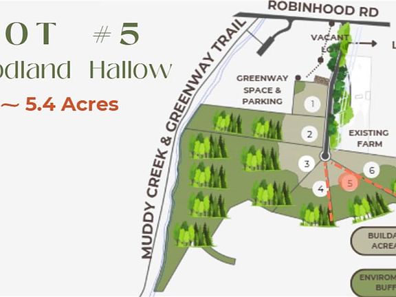 Rare in-city acreage at The Preserve at Robinhood Ridge—just six homesites across 54 acres. Lot 5 – Woodland Hollow is an approx. 5.4-acre homesite offering approx. 1.1 buildable acres on a quiet cul-de-sac in a peaceful, wooded setting. A gentle slope leads to a large, flat clearing, where a natural stream flows through an environmentally protected area, enhancing the sense of serenity and privacy. Ideal for custom home construction with our curated group of preferred builders. Public water, sewer, natural gas, and high-speed fiber available. Minutes to grocery, schools, and everyday amenities. Conveniently located approximately 15 minutes from downtown Winston-Salem.