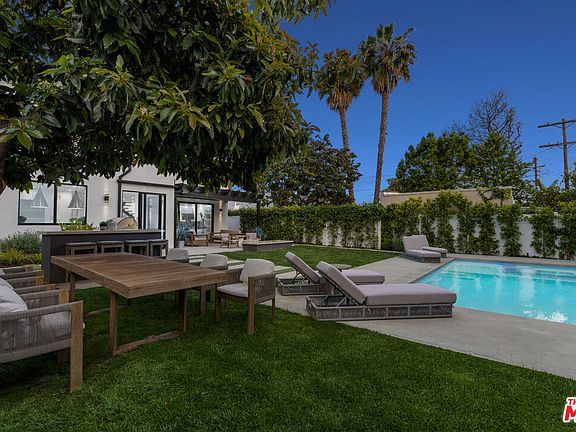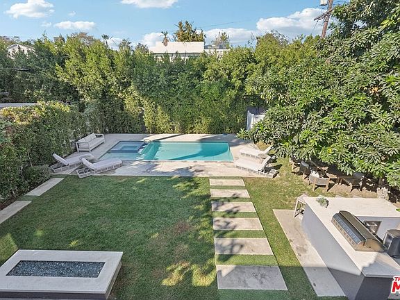 This property comes fully furnished and is all set for you to move in right away. Immerse yourself in the epitome of luxury and tranquility with this stunning, newly constructed home in Beverly Grove. This architectural masterpiece welcomes you with a sweeping open floor plan and elegant oak wood floors. The main level features an executive office, a cozy fireplace-accented living room, and a chef's kitchen equipped with Thermador appliances, a stone-topped center island, and expansive sliding glass doors leading to the meticulously manicured backyard. Step outside to discover an outdoor oasis boasting a fully equipped kitchen, a comfortable lounge area, and a magnificent pool and spa surrounded by lush Ficus plants for ultimate privacy and serenity. Ascend the floating stairs to the opulent master bedroom with a deluxe en-suite bathroom, his-and-hers closets, and a terrace overlooking the peaceful backyard. Three spacious bedrooms, one with a terrace offering street views, complete this level. The lower level is an entertainer's dream with a generous great room, state-of-the-art theater, two additional en-suite bedrooms, a storage room, a laundry room, and a captivating glass wine cellar. This privately gated home is just steps away from Los Angeles' finest dining and shopping, making it the perfect residence for those seeking elegance and convenience.