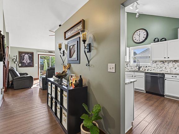 Welcome to this stunning 3 bed, 3 bath home in Sunbury! Featuring an open floor plan with vaulted ceilings and new flooring throughout, this home offers both comfort and style. The updated kitchen boasts a beautiful backsplash, quality countertops, well-accented black appliances, and a charming bay window that fills the space with natural light. The main floor suite includes a spacious bedroom and private master bath. Upstairs, you'll find two generous bedrooms and a full bath. The lower level offers two additional versatile rooms—perfect as bedrooms or offices—a large rec area, and a third full bath. Exterior highlights include attractive vinyl siding with stone accents around the bay window, a fenced backyard with patio, and an outdoor building for extra storage. A widened driveway provides ample parking space for up to three vehicles. Don't miss this beautiful, move-in ready home with space for everyone!