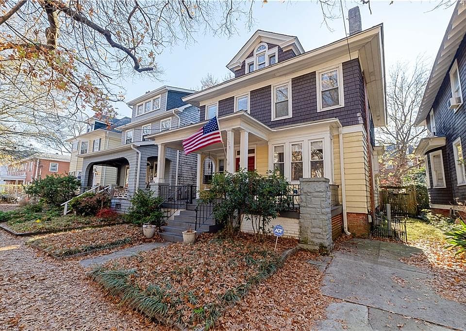 Beautifully located in the heart of Ghent, this early-1900s Colonial Revival offers classic charm, tall ceilings, great natural light, and over 2,400 sq ft of flexible living space. A bright foyer opens to spacious formal living and dining rooms with decorative fireplaces and hardwood floors. The main level includes a full bath and a well-sized kitchen with excellent layout potential. Upstairs features an expansive primary suite with its own bath and laundry closet, plus two additional bedrooms and a hall bath. The finished third floor adds a large bonus room or private 4th bedroom with walk-in closet. Enjoy the wide front porch, fully fenced backyard with patio and rainwater harvesting, and rare driveway parking. A new slate roof provides long-term value and timeless curb appeal. All just a block from vibrant Colley Ave—coffee shops, cafes, restaurants, breweries, parks, and everyday conveniences right at your doorstep.