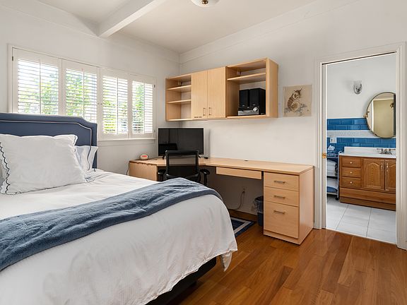 The first available bedroom has a queen-sized bed, a work area, an attached bathroom exclusively for use of the occupant, a door that opens to the hallway, and another door that opens to the backyard pool area. This bedroom is $1600 per month.
