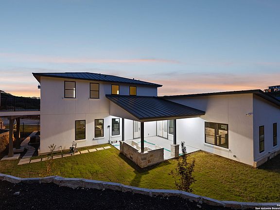 Enjoy your bright, spacious office, living, dining and kitchen with expansive views of the hill country as you enter through the custom-built metal front doors. This custom beauty was designed and built with abundance in mind----from the extra-large living spaces, to the fine details such as ample electrical outlets--the things you won't find in a volume-built home. The oversized kitchen is a chef's dream with the 48" range and abundant cabinet storage, to the oversized island with Calcutta Gold quartz waterfall design detail. Perfect for entertaining, the buyers will enjoy the open entryway, living, dining, and outdoor kitchen/living spaces--all flowing into one another, and offering highly-durable and low-maintenance porcelain tile flooring. The owners' suite, measuring a massive 20 x 17'+ includes a huge shower with multiple shower heads, and a Woodbridge Chromotherapy Lighted tub....and also perfect for the owner who loves abundance: the 20' x 14' huge closet. A secondary-suite downstairs measuring 15'x14'+ with en suite bathroom is a perfect split-bedroom, downstairs layout. And the two secondary bedrooms upstairs offer expansive hill country views, spacious layout at 17'x15' each, and en suite bathrooms for the ultimate privacy. The icing on the cake for the upstairs bedroom suites is the private balcony overlooking the very private back yard. Buyers will love the large, covered patio with gas grill, sink, and storage space for your perfect outdoor living lifestyle. Pre-approved buyers may schedule a private showing to see this new construction beauty in the highly-sought-after Cresta Bella community: but hurry before it's gone, as it's the only new construction, nearly-completed home currently available in the development.