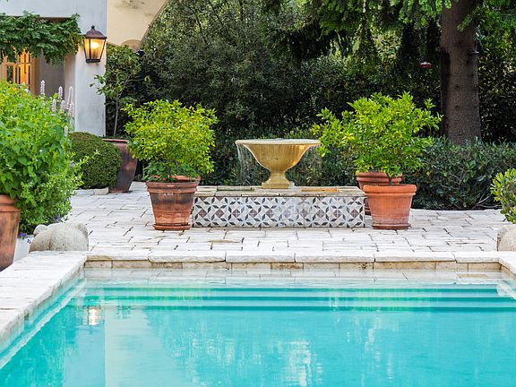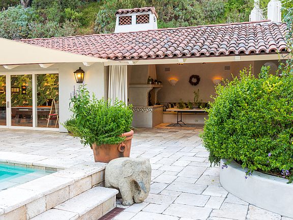 Estate compound of magical environs near the pinnacle of Outpost Estates accessed via Mulholland. Imposing gates greet visitors who are led to the residence over a hewn rock driveway to a large Motorcourt. Aquamarine Pool is surrounded by quarried Italian travertine and overlooked by the Cabana and outdoor Dining Lounge w/ fireplace. Virtual indoor/outdoor living made possible in the chef's elite Kitchen w/premium appliances & beautiful tile inlay. Unforgettable Master Suite with Roman bath & sky dome ceiling. An air of comfortable luxury pervades the living spaces -- world class resort and private home merged as one.
