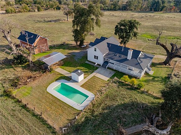 Immerse yourself in charming country living with this enchanting 5-bedroom, 2-bathroom farmhouse perfectly blending rustic charm with modern updates. Evoking the timeless romance of a home "right out of the movie *The Notebook*," this property offers a truly idyllic lifestyle on 13 acres of irrigated land. Spanning 2,547 sq ft, the home is thoughtfully laid out for comfortable living. Three generous bedrooms are located on the main floor, with two more cozy bedrooms upstairs, offering flexibility for family and guests. The large, open-concept kitchen has been beautifully updated, complemented by a separate, spacious laundry room. The inviting living room is bathed in natural light and features a classic wood-burning fireplace perfect for cozy evenings. Enjoy peace of mind with newer flooring, fresh paint, and a newer central heat and and air unit for year-round comfort. Step outside to discover a property built for relaxation and utility. A sparkling pool awaits for summer fun and entertaining. The property includes a substantial two-story barn with two large barn doors, offering endless possibilities for storage, workshop space, or potential conversion. Covered parking is provided by a convenient carport. The 13 acres of irrigated land are managed with reliable water from the El Camino Water District, ideal for agriculture, livestock, or maintaining lush grounds. The land backs up directly to the peaceful McClure Creek, adding to the serene, natural beauty of the setting. This rare gem offers a fantastic combination of country living and commuter convenience. Located just off the Gyle exit of I-5 and Highway 99W, the home makes for an easy commute to surrounding areas. Utilities here are propane for gas, a septic system for sewer, and a well for water.