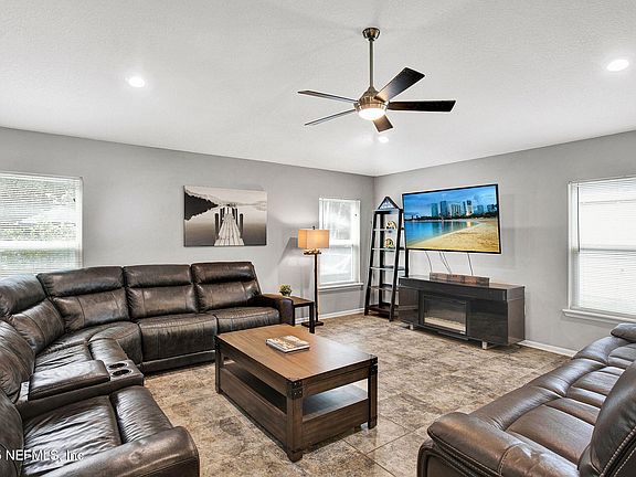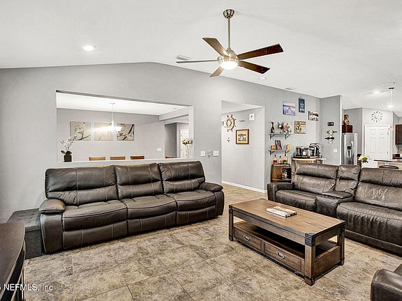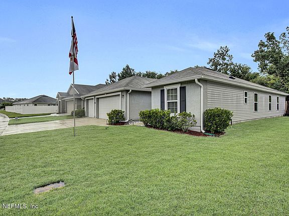 Located just minutes from I-295, this stunning 3-bedroom, 2-bath home offers convenient access throughout Jacksonville. Spanning 1,884sf, you're greeted with an open-concept layout and a rare 3-car garage with upgraded extended depth and epoxy flooring. Inside, tile flooring flows seamlessly throughout the main living areas, creating a spacious and inviting atmosphere perfect for entertaining. The kitchen opens to the living room, offering unobstructed sight lines and a natural gathering space for family and friends. Granite countertops add a touch of elegance, complemented by a dedicated dining room for more formal occasions. The generous primary suite includes an expansive walk-in closet designed to accommodate wardrobes of any size. The en-suite bath features a double vanity and a relaxing soaking tub for a spa-like retreat. Sliding glass doors off the kitchen lead to an enclosed patio, ideal for enjoying the private backyard and sparkling pool. Additional highlights include an indoor laundry room and a prime location near NAS Jacksonville, with a wide variety of shops, restaurants, and amenities nearby in a fast-growing area.