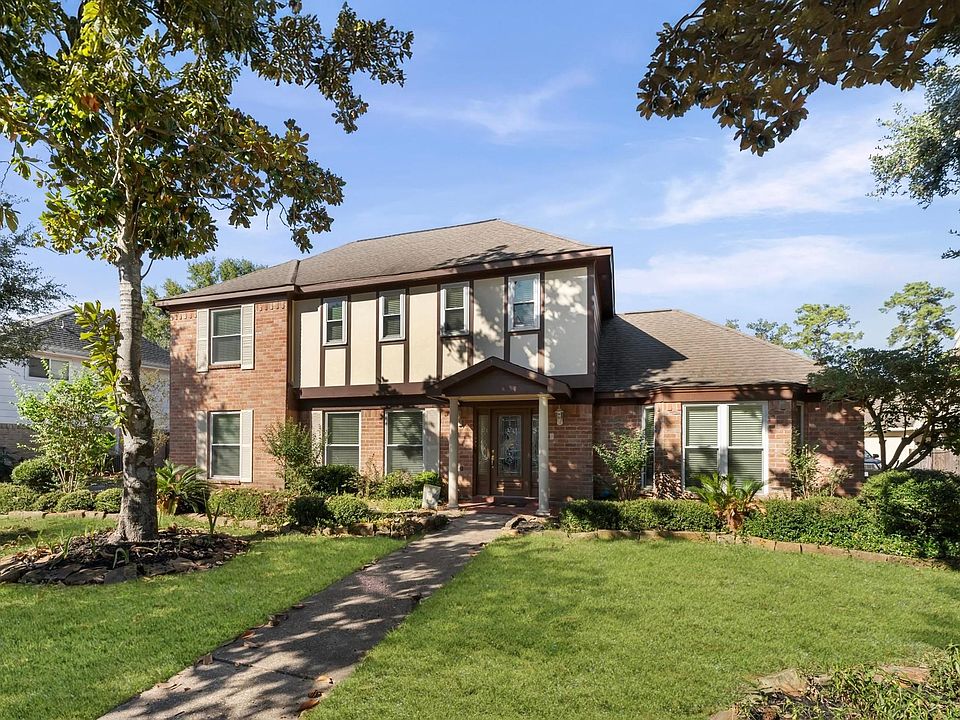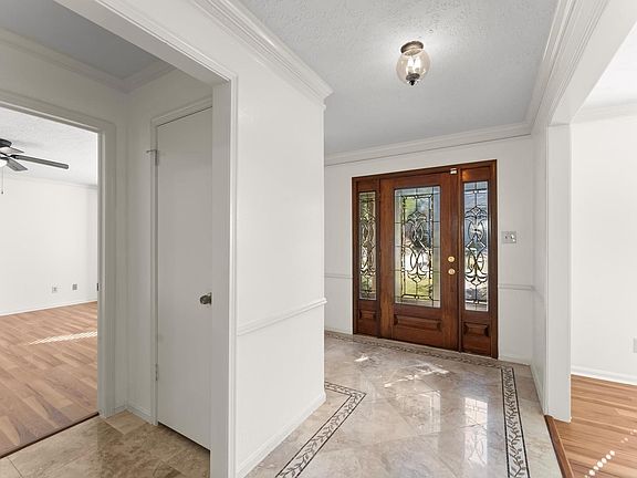 Step inside to find bright, inviting interiors featuring Travertine accented entry floors, large picture windows, and crown molding throughout. The kitchen is complete with granite countertops, stainless steel appliances, and classic white cabinetry—perfect for both everyday living and entertaining. The formal dining and living spaces offer warmth and versatility, while the family room’s fireplace creates a cozy centerpiece for gatherings.