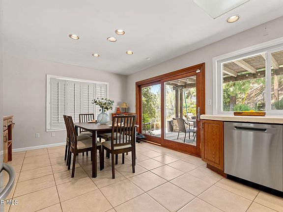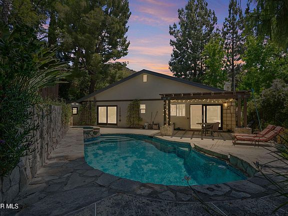 Upon entry, you're greeted by vaulted ceilings that enhance the spacious feel and flood the home with natural light. The thoughtfully designed interior includes a dedicated home office space, ideal for remote work. The inviting outdoor space features a pool and patio area surrounded by mature trees, creating a perfect setting for outdoor dining and relaxation.