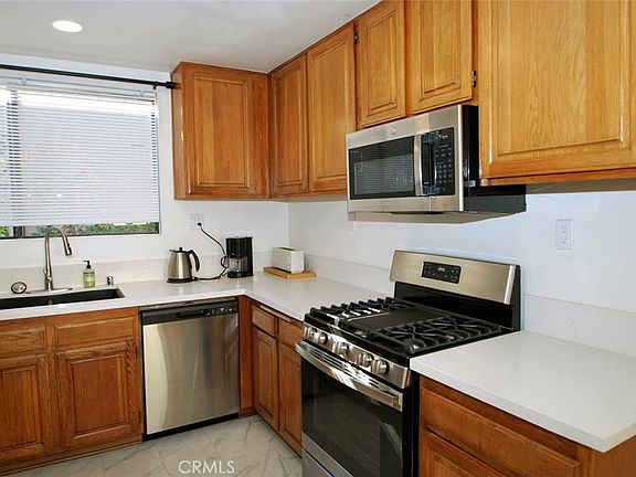 This end unit townhome with oversized windows and only one common wall is truly flooded with light! Cooking enthusiasts will enjoy all new kitchen appliances, beautiful countertops, recessed lighting, and a serving bar in this modern kitchen with eat-in breakfast area and pantry. First floor also features a dining area, living room with fireplace, bathroom and private patio. The rest of this updated and well maintained two-bedroom property includes a recently installed air conditioner HVAC unit, honey-oak colored flooring, skylight, and tons of storage. Huge upstairs bathroom features double sinks, full bathtub plus a separate large stall shower! You’ll appreciate easy and secure access to the property through an electric gate and attached two-car garage. In addition, there is an amazing large grassy recreational area behind the large pool! Don’t miss the chance to snatch up this desirable end unit boasting pride of ownership, just minutes from local shopping and restaurants.