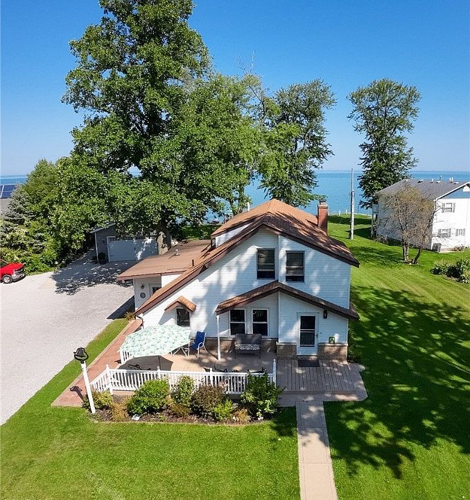 'Live the Lake Life': One of a kind Lake Front property. Meander down a 600' lane alongside forest, ravine & creek. Find this casual, classic 2000 sq ft home. On the main level the spacious residence offers a lovely living room w/cozy gas fireplace open to sunroom boasting fabulous views of the lake, sunrises, sunsets, eagles soaring, vessels sailing by. Prep meals in the oversized kitchen w/honey oak cabinets, lots of counter space, dine in the sunny, bright dining room, convenient first floor laundry w/entry, bath w/soaking tub & shower, 1 lake view bedroom. Travel to second floor, plenty of room for house guests w/ 3 more bedrooms, including master bedroom w/ shared bath, hallway, tons of storage. Outdoors the 1.38 acre lot boasts mature wood line, open grass areas for volleyball, picnics, relax on the house deck focused on casual seating/dining, stamped concrete patio outside the sunroom, big beach deck overlooking the shore, stairway down to the beautiful sandy beach. Strong concrete erosion wall flanked by 2 hefty armor rock walls on each end. 2 car garage, shed. Loads of options; VRBO, summer retreat, building possibilities (check zoning). Across from Lake Erie Shores Golf Course, close to parks, Spire, beaches, Geneva State Park Lodge & Marina, Geneva-on-the-Lake. 'Live the Lake Life' in this Lake Shore Retreat. Crack a bottle of wine, build a fire, relax on the beach, play some golf, kayak, boat, watch a sunset, enjoy friends & family. Click the Virtual Tour.