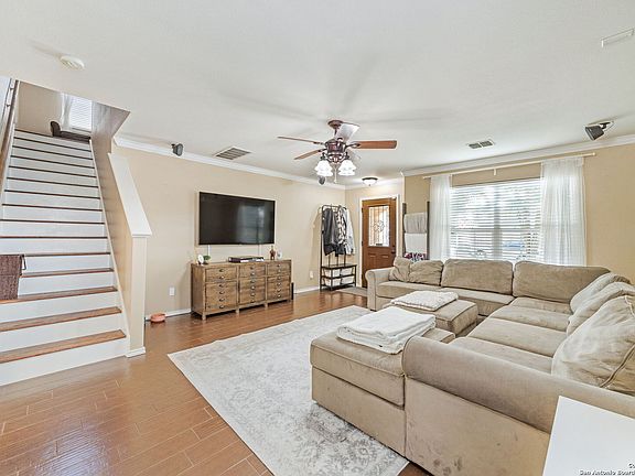 This extremely well-kept four (4) bedroom, three (3) full bathrooms that offers a Multi-generational floor plan. In-law's suite is downstairs with a full bathroom. Foundation has been stabilized by StoneHouse Foundation Company with a Lifetime Warranty. Updates include an open-concept kitchen with new cabinets, new subway tiles, and 1.5-inch granite extended counter tops. The spacious owner's suite is upstairs w/ Full bath and large walk-in closet. Two (2) other bedrooms with another Full Bath and a big game room. All bedrooms have Berber carpet all other rooms have laminate or ceramic tile. There is ATT Fiber in the neighborhood. Crown molding downstairs. Samsung surround sound in the upstairs game room and downstairs family room. Roof replaced 2018, Exterior paint 2018, 4-ton 15 SEER American Standard AC installed 2015. Ceiling fans in all bedrooms. This home backs to Sol Trce, No back neighbors. The back fence is concrete and is maintained by HOA. Nice, covered patio and a big backyard with additional sitting areas ideal for hosting a Bar-B-Q or just relaxing. Utility building with electricity to charge and store all your lawn equipment. Conveniently located minutes from Lackland Air Base, Schools, Shopping centers, restaurants, and freeways 410,90, 1604, 151.