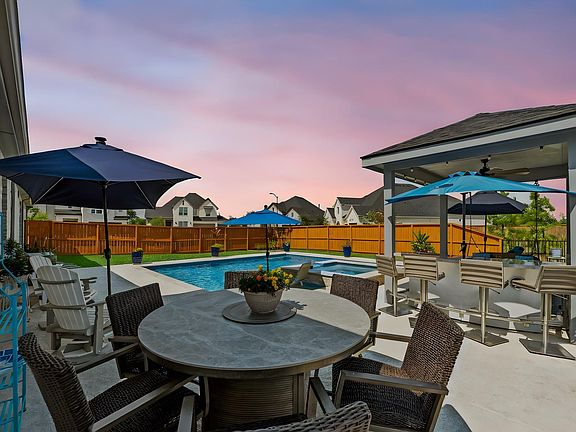 Striking fireplaceFully equipped outdoor kitchenExtended covered patioUpgraded black-framed windowsQuartz countertopsQuiet cul-de-sacSpacious three-car garage