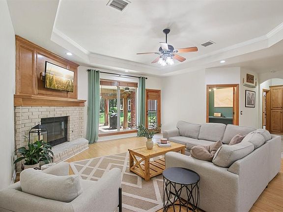 Welcome to your own private retreat on a spectacular .83-acre wooded lot! This park-like backyard offers exceptional privacy with mature trees and ample space between neighbors. Enjoy outdoor living year-round under the solid cedar pergola with rain cover, outdoor fireplace, and stamped concrete patio. The outdoor kitchen is a showstopper, featuring granite bar tops, a Green Egg grill, a searing station, and stainless steel storage—perfect for entertaining! The 3-car tandem garage includes a mini-split heat and air system, storm shelter, and plenty of space for a workbench or storage. Out back, the detached workshop is fully powered with electricity and includes a built-on storage extension ideal for parking a trailer or boat.